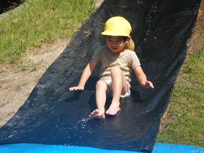 手作りウォータースライダー in 江北白百合幼稚園の山荘 栃木県鹿沼市shorts。