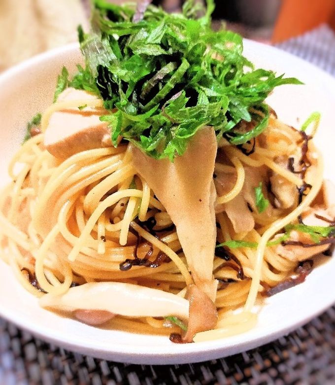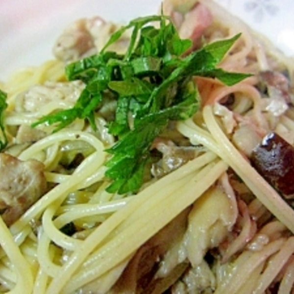 きのこずくしの鶏肉&茄子&大葉の和風パスタ。