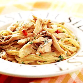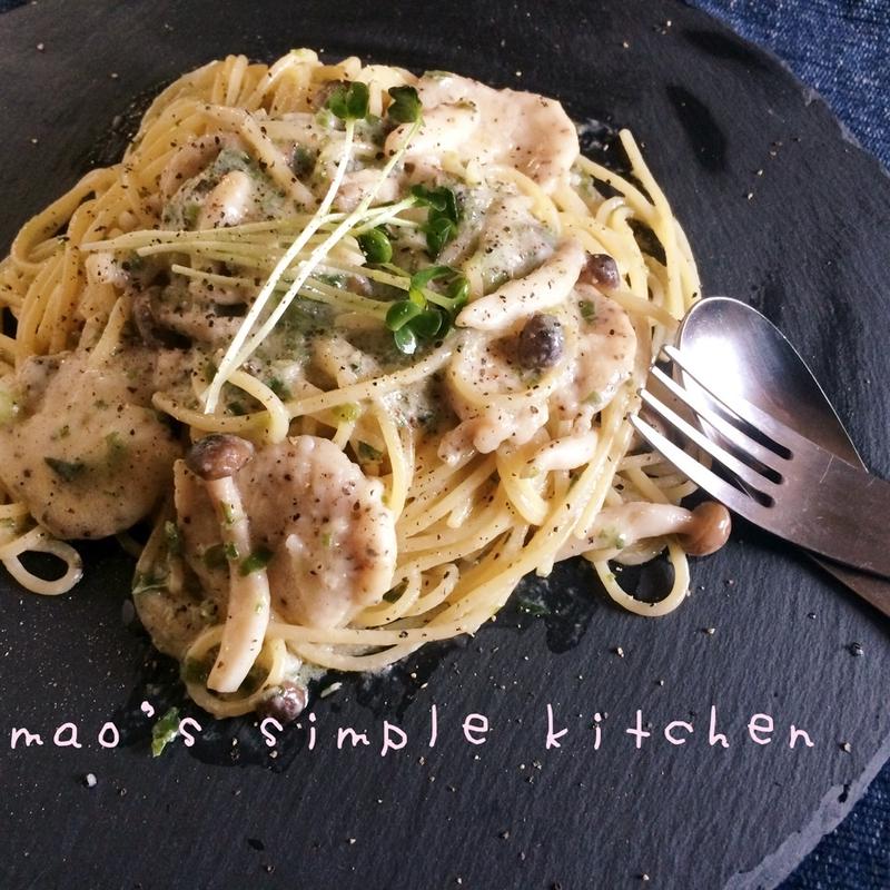 ほぐし鶏とキノコの和風スパゲッティ レシピ、作り方!!furca。