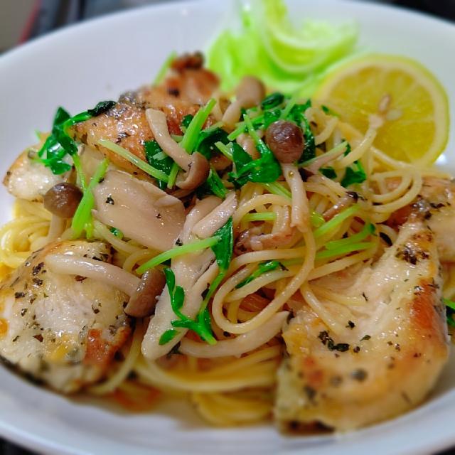 鶏むね肉のバジルチキンと きのこ 豆苗のパスタ 砂糖味屋キッチンSnapdish スナップディッシュID:raq54a。