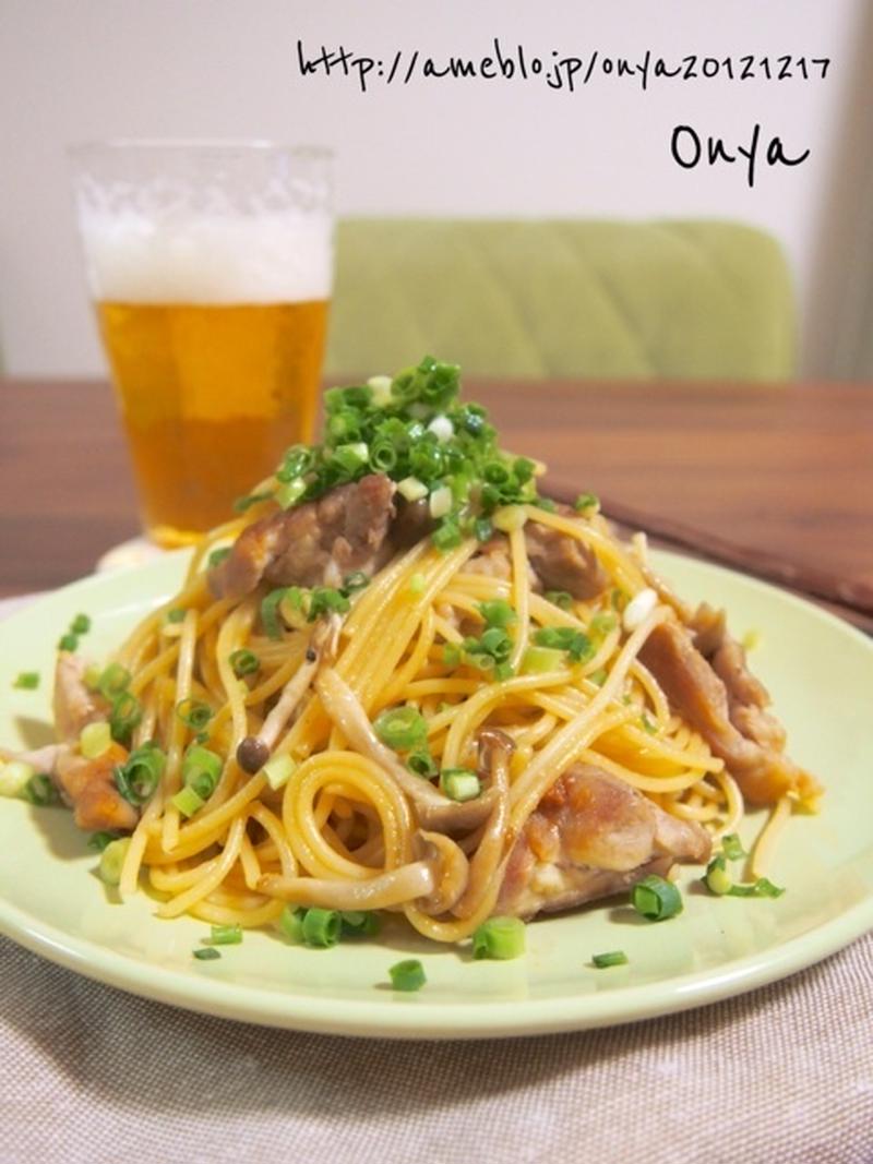 鶏むね肉ときのこのあっさり味ぽんパスタ。