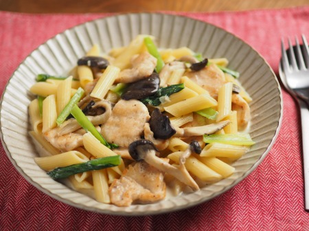 牛乳でお手軽!鶏むね肉ときのこのクリームパスタ。