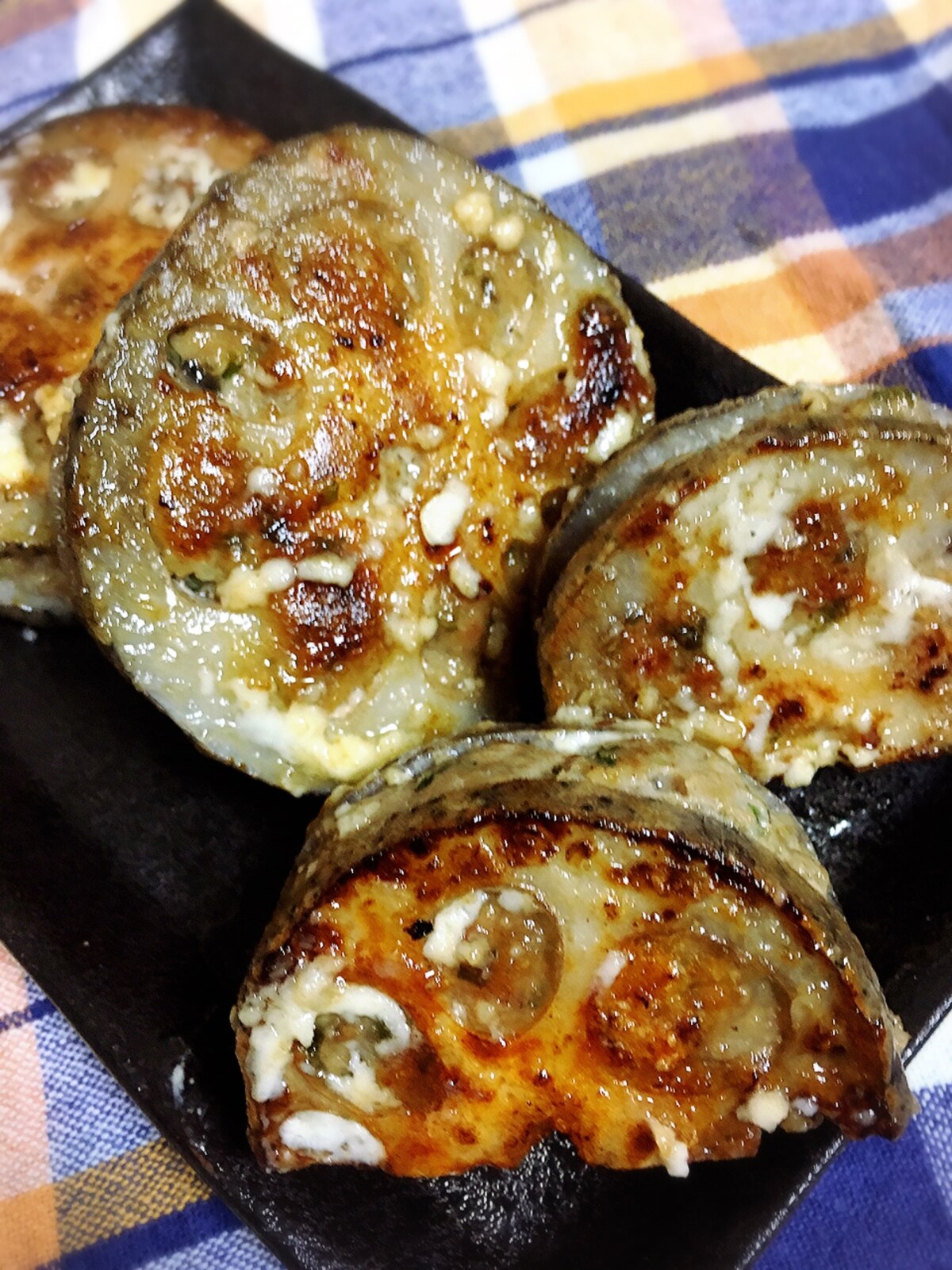 簡単おつまみ!れんこんと大葉明太子のはさみ焼き。