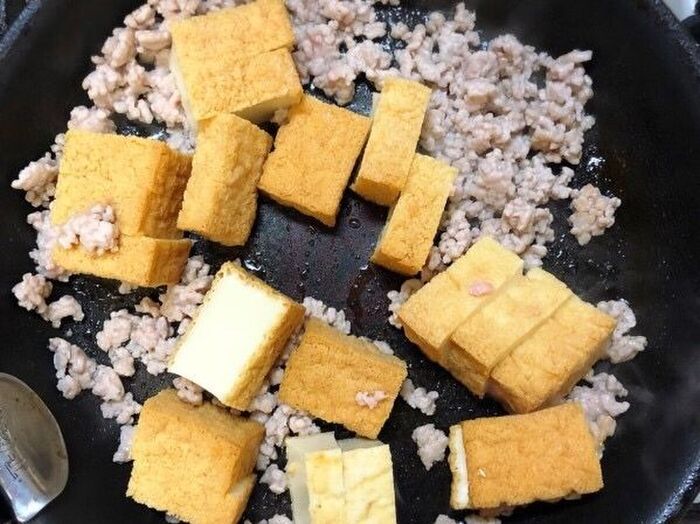 息子の大好物!ぷるぷる厚揚げとそぼろの甘辛炒め。