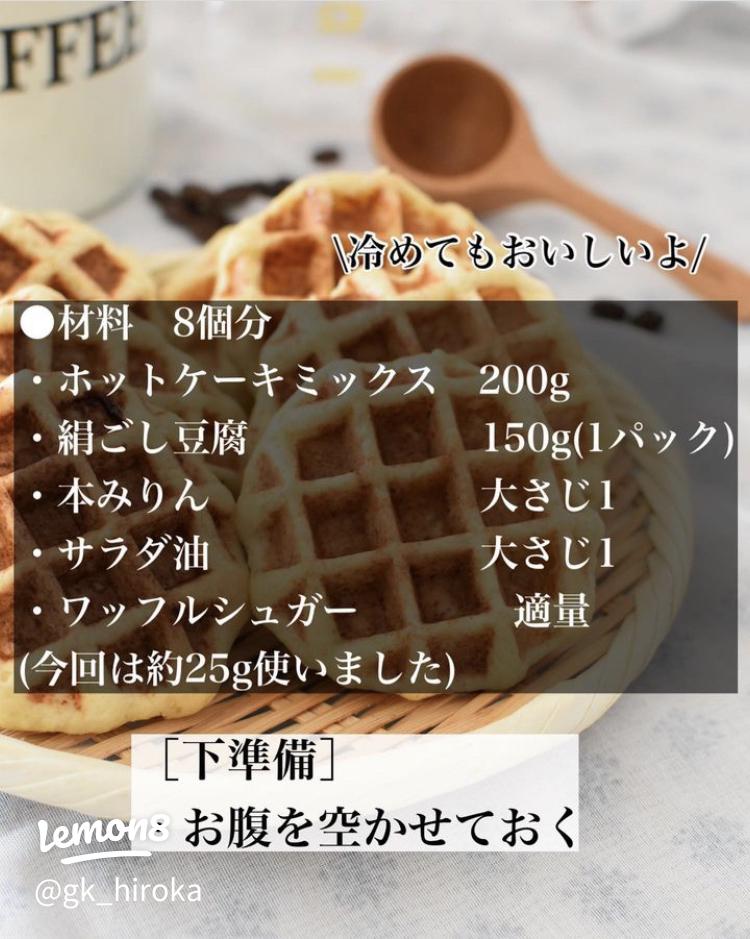 ○材料 8個分 ・ホットケーキミックス 200g ・絹ごし豆腐 150g 1パック・本みりん 大さじ1 ・サラダ油 大さじ1 ・ワッフルシュガー適量今回は約25g使いました––––––––––––––––––––––––––––––––––––––– ○作り方下準備・お腹を空かせ ておく ➀ホットケーキ。