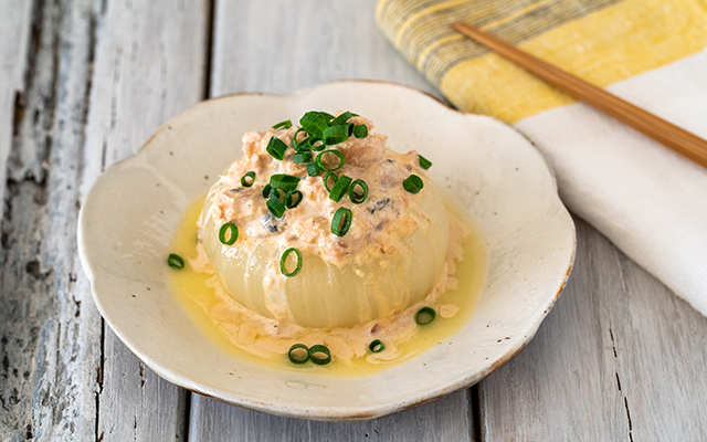 まるごと新玉ねぎのレンジ蒸しかつおマヨしょうゆがけ。