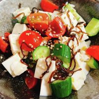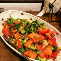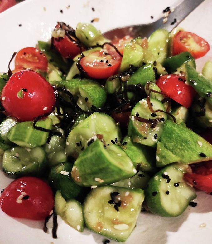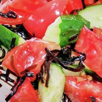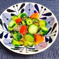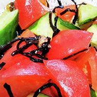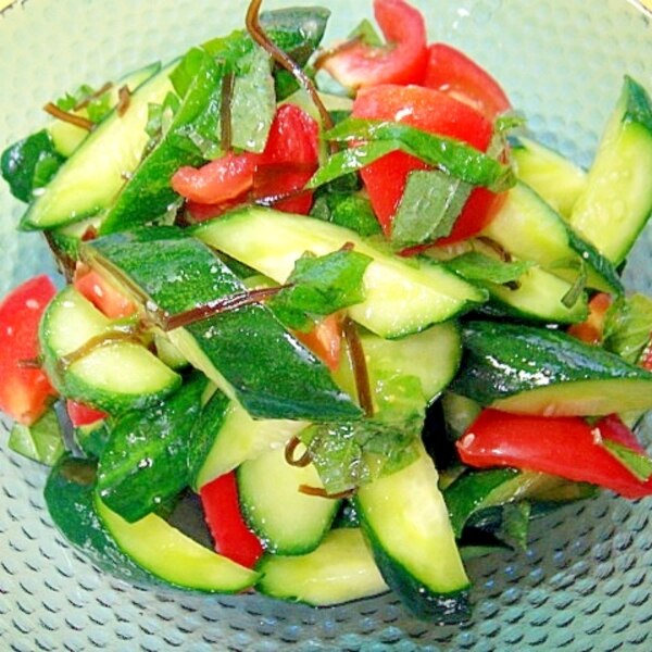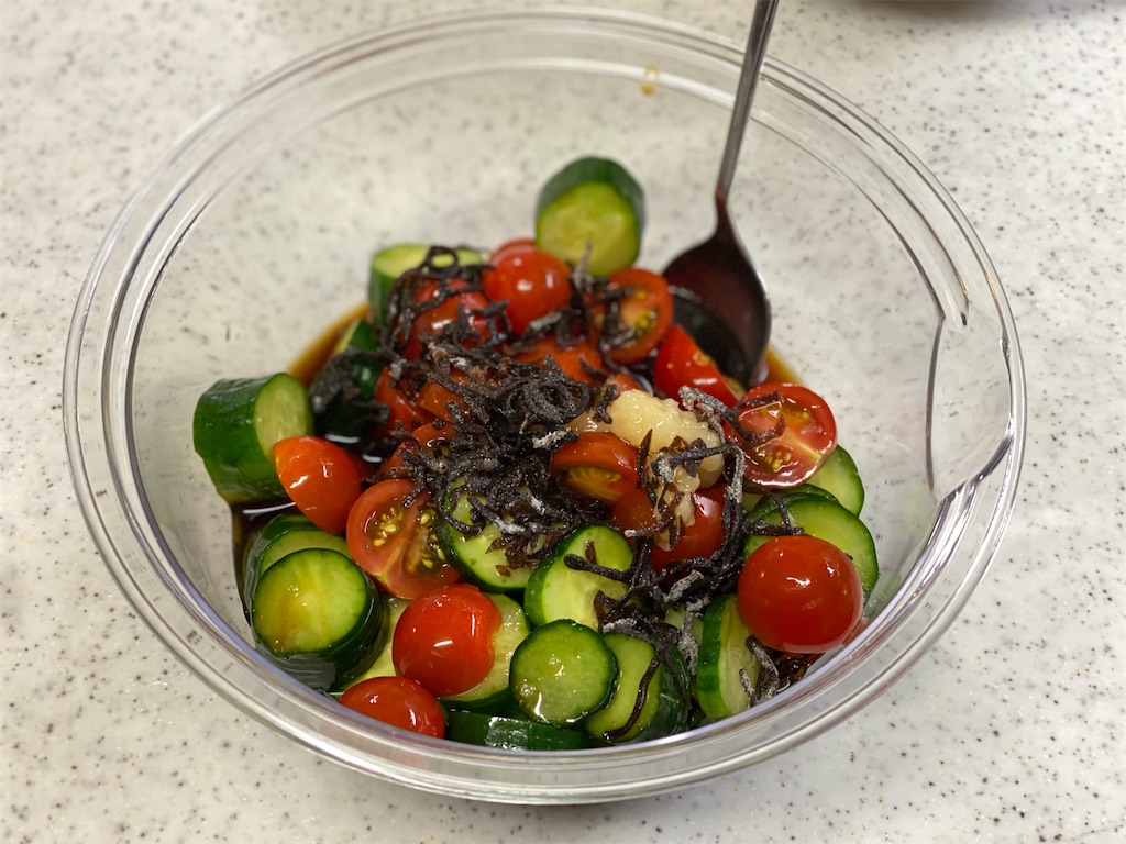 *トマトときゅうりと香味野菜の塩昆布サラダ*。