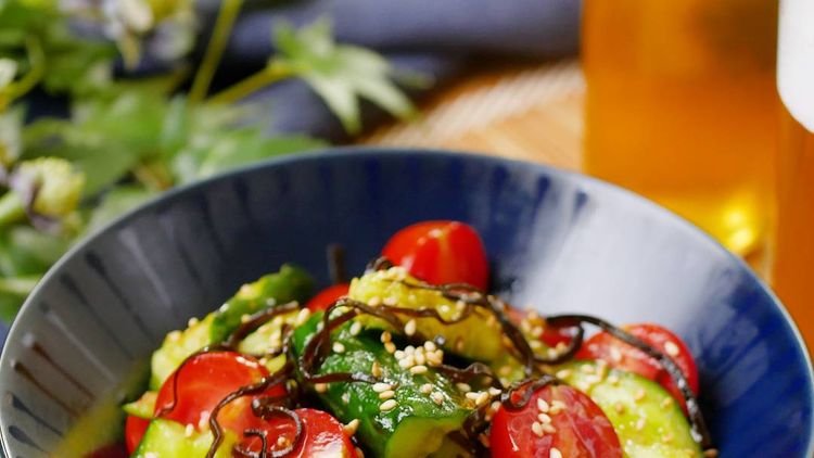 きゅうりと ぷちトマトの塩昆布和えのレシピ ごま油- YouTube。