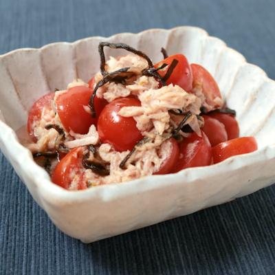 材料3つで簡単 ミニトマトとツナの塩昆布和えサラダ。