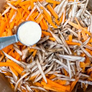 きんぴらごぼうカチカチのごぼうとしなしな人参できんぴら若杉ばあちゃん のレシピを参考に作ります! . ◇ごぼうと人参を優しく洗って切る◇セラポットを中火にかけ、胡麻油を入れる 温まったらごぼうを入れ、塩をひとつまみ入れて炒める 弱火にしてよく炒め。
