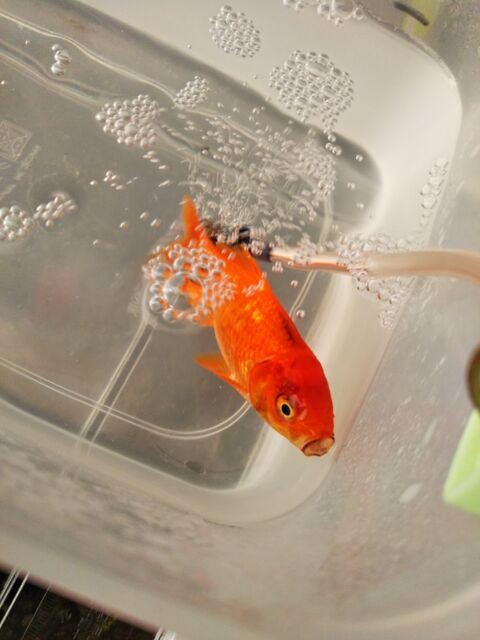 金魚 転覆病⁉︎ いいちゃん、塩浴治療始めます 良くなってね。