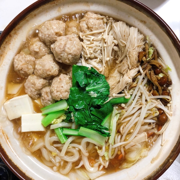 ふわふわ豆腐入り肉団子の和風しょうゆ鍋。