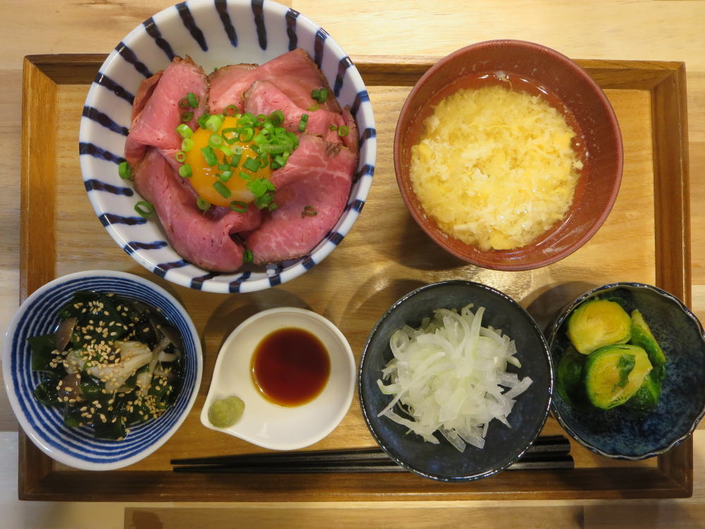 ローストビーフ丼、なすの揚げびたし、ケールとレーズンのサラダ、などの献立。