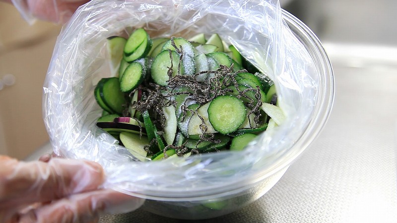 ポリ袋で簡単!きゅうりとなすとシソの塩昆布浅漬けサラダ。
