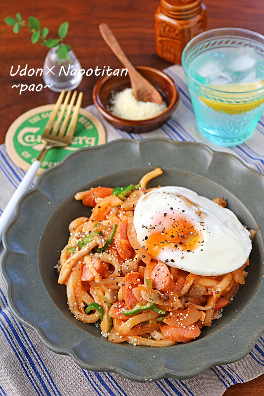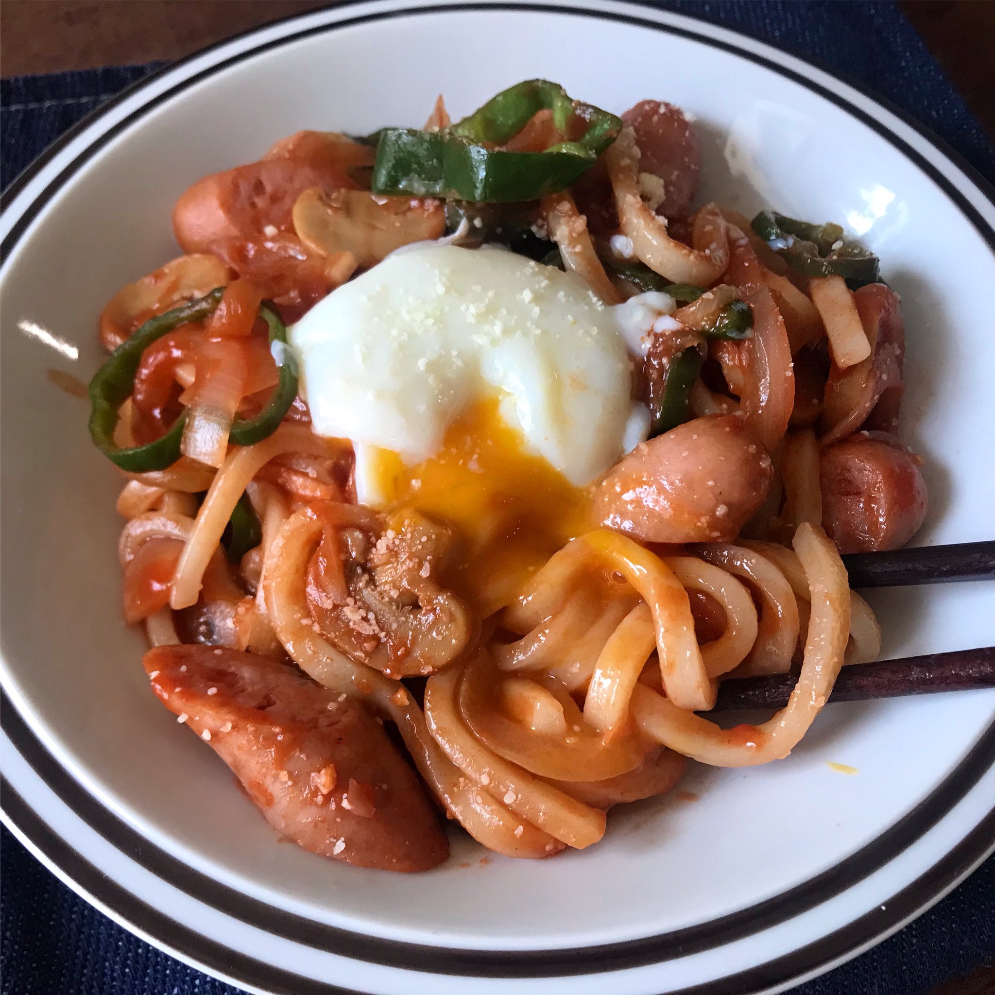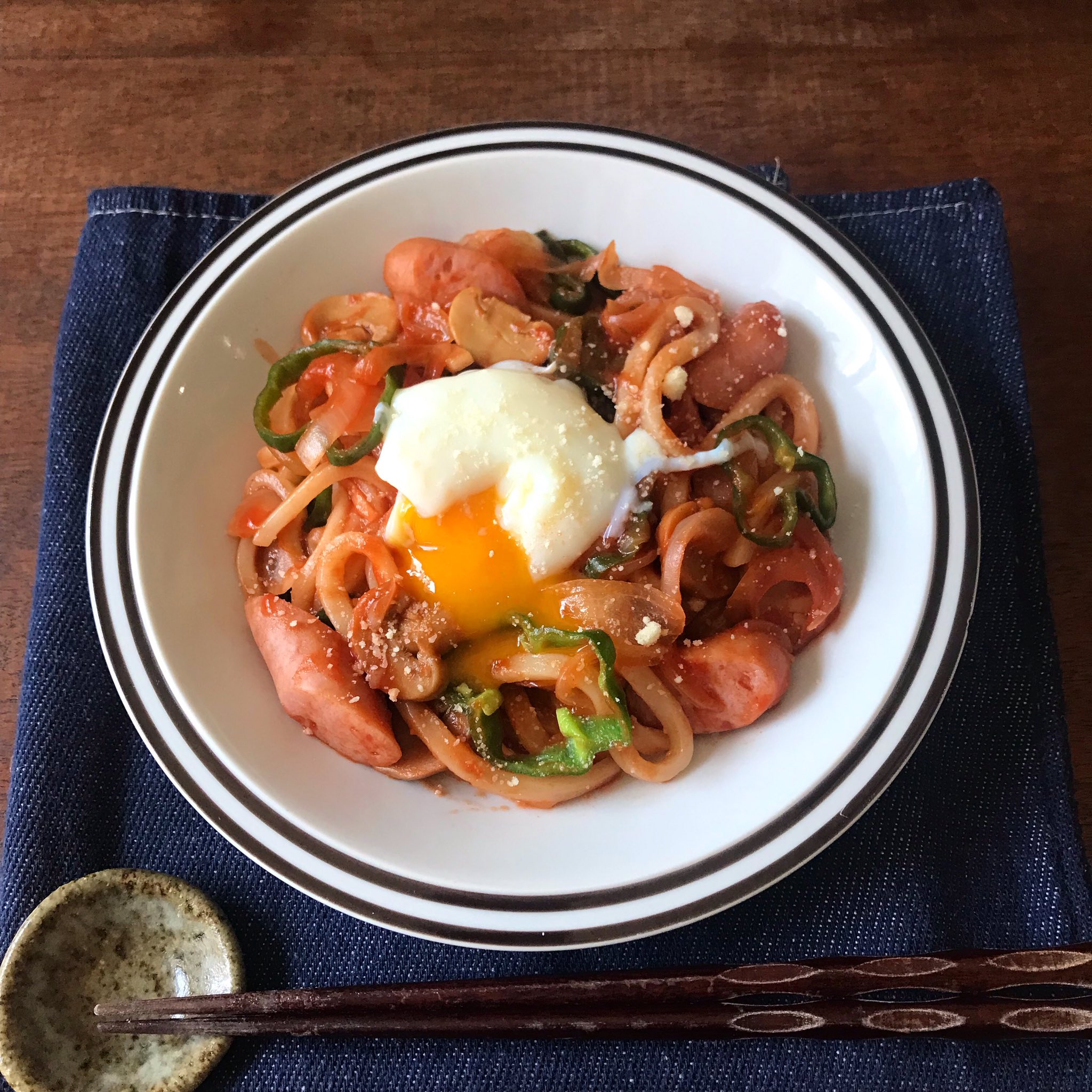 冷凍うどんで作るナポリタンと温泉卵TikTok。