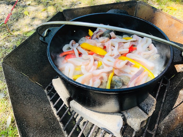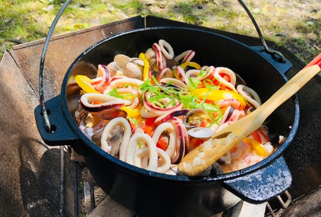 キャンプ料理 簡単料理を屋外で♪ダッチオーブンでパエリア栄養士堀口泰子〜食からつくる元気と幸せのかたち。
