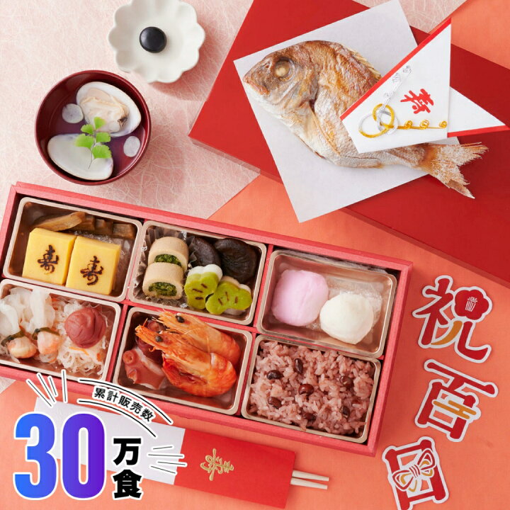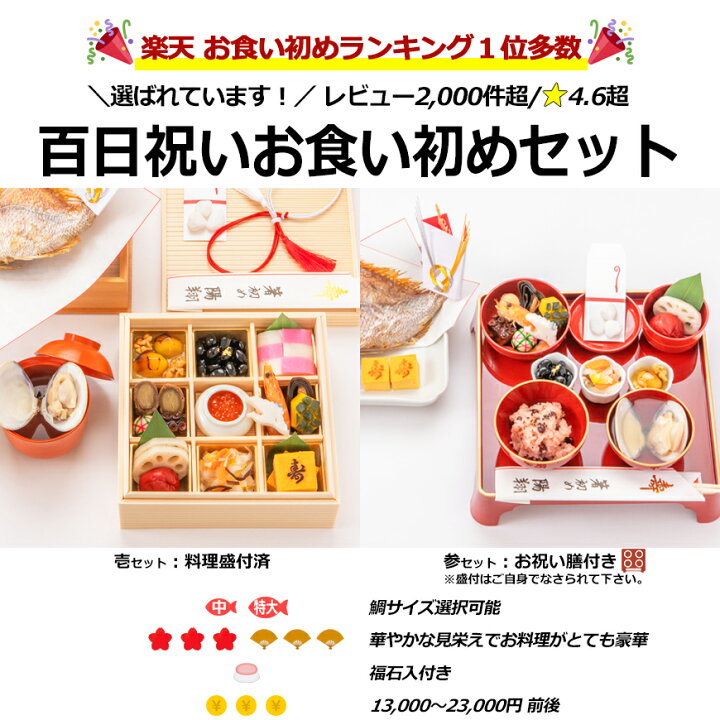 楽天市場楽天1位3冠 お食い初め 料理セット壱&参百日祝い 100日祝い に最適な焼き鯛付き料理鯛のサイズや祝い膳 男児朱・女児黒 も選択OK蛤・歯固め石・祝い箸・解説書付き盛付済or盛付け式蛤吸・赤飯の追加購入可鯛飾り付: 季膳味和 楽天市場店。
