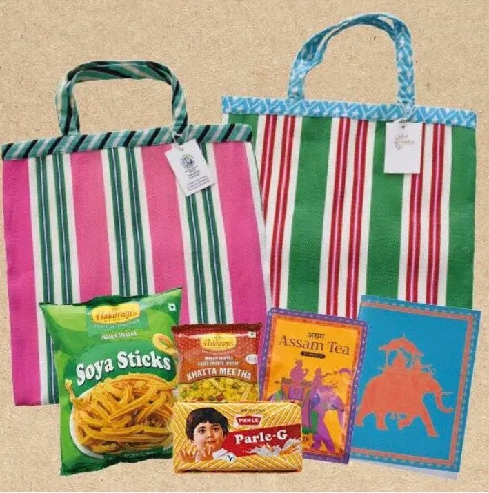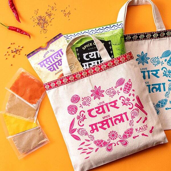カルディ、古布とリサイクル糸で作った「インドマーケットバッグ」。紅茶やインドのスパイシーな菓子などがセット - グルメ Watch。