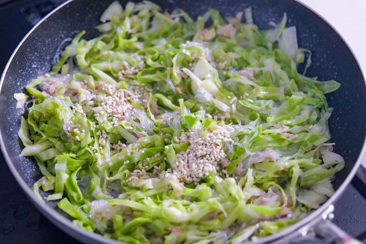 フライパン1つでおいしさ増し増し♪「春キャベツとツナの春雨炒め」。