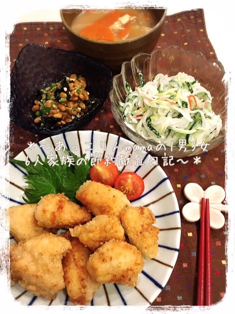 93円 むね肉の塩唐揚げ献立*〜あっこりんmamaの1男3女 6人家族の節約献立とお弁当日記〜*。