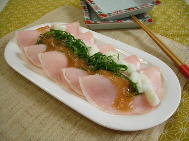たたき長芋と大葉の梅肉ハムサラダ。