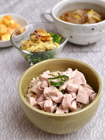 塩豚。“ももブロック” 煮汁で塩おこわ風ごはんの晩ご飯。ちょりまめ日和。
