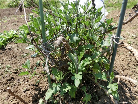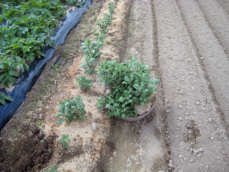 わが家の食用菊づくり-前年の株から出た芽をさし芽するか株分けした苗を露地の畝に定植します。