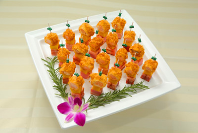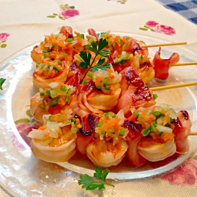 海老とベーコンのピンチョス 刻み野菜ソース食品の委託製造・食品OEM 泉万醸造株式会社。