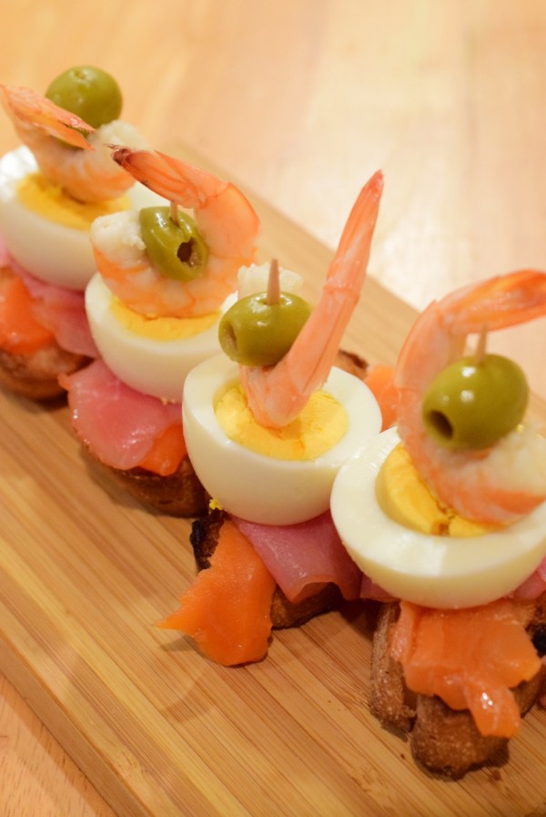 ピンチョス各種 うずらの卵と生ハム、エビ、砂肝、鯵のオイルサーディン Koi-Chef Blog。