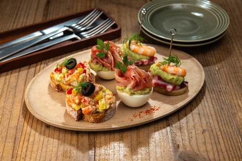海老とベーコンのピンチョス 刻み野菜とグリーンオリーブパテGranjapon:enpatio~中庭でのひととき~スペインの心地良い風にのせてお客様の「あったらいいな」をご提案致します。