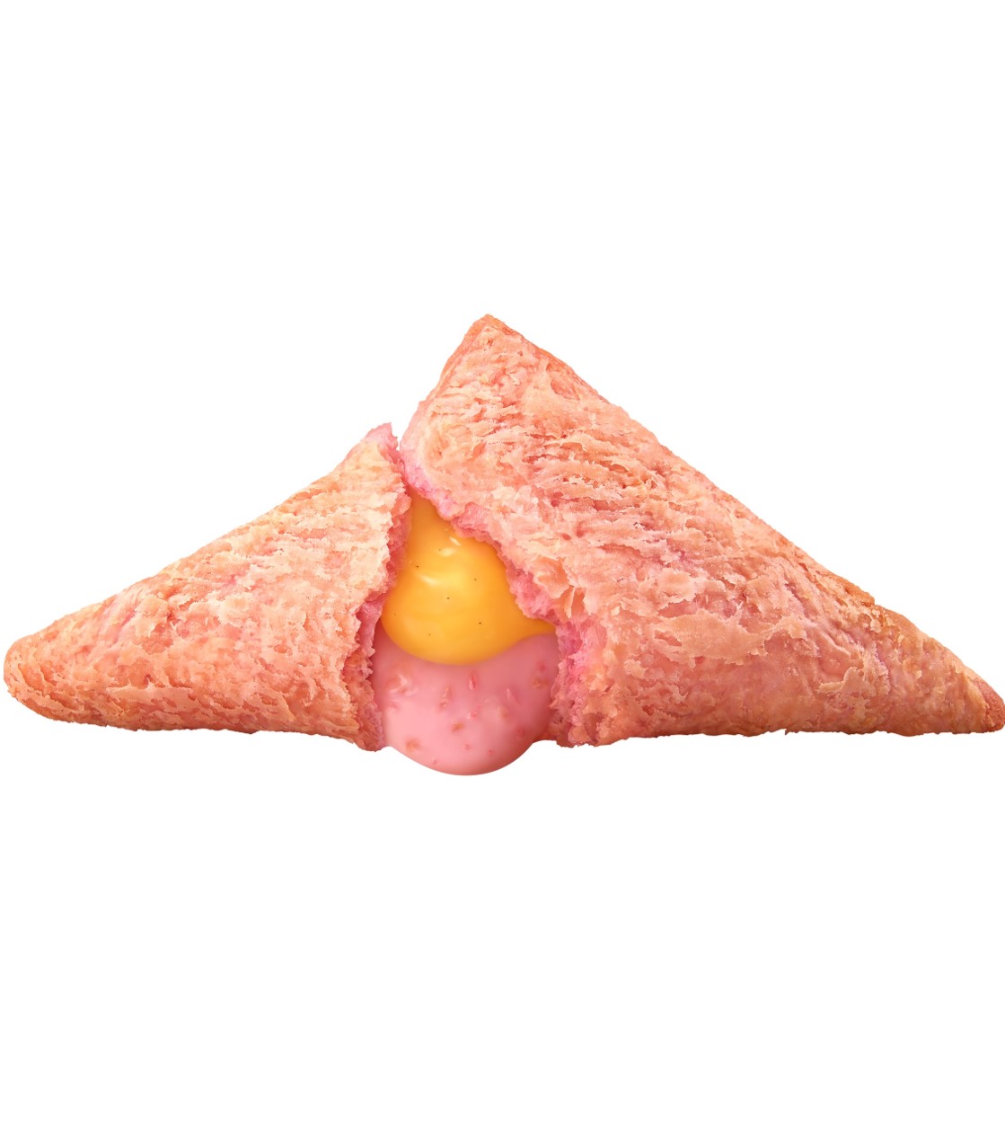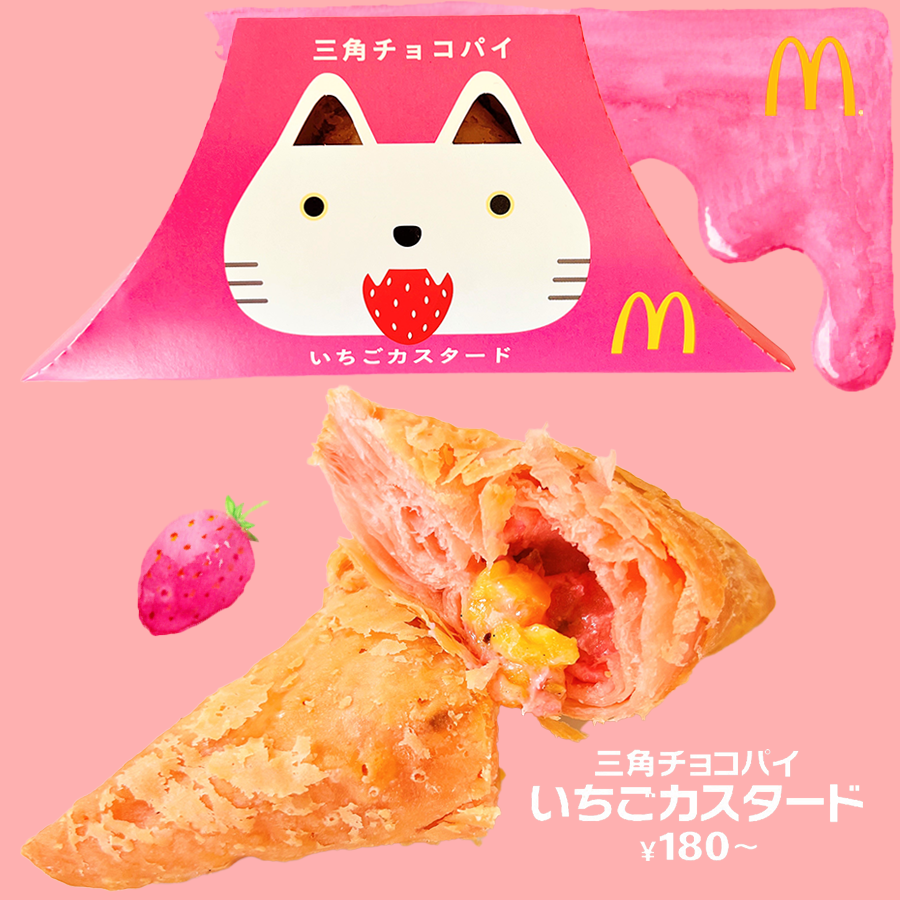 11月8日 水 より、マクドナルドが「三角チョコパイ いちごカスタード」を新発売します。 ストロベリー チョコクリームとカスタードクリームのハーモニーと、サクサクとしたパイ生地の食感を楽しめる新作ホットスイーツです。三角チョコパイいちごカスタード三角。