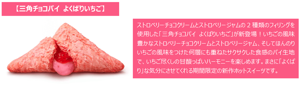 三角チョコパイ よくばりいちご」マクドナルドにて期間限定で販売!いちごの風味豊かなストロベリーチョコクリーム&ジャムの味わい♡ 詳細記事SGS109。