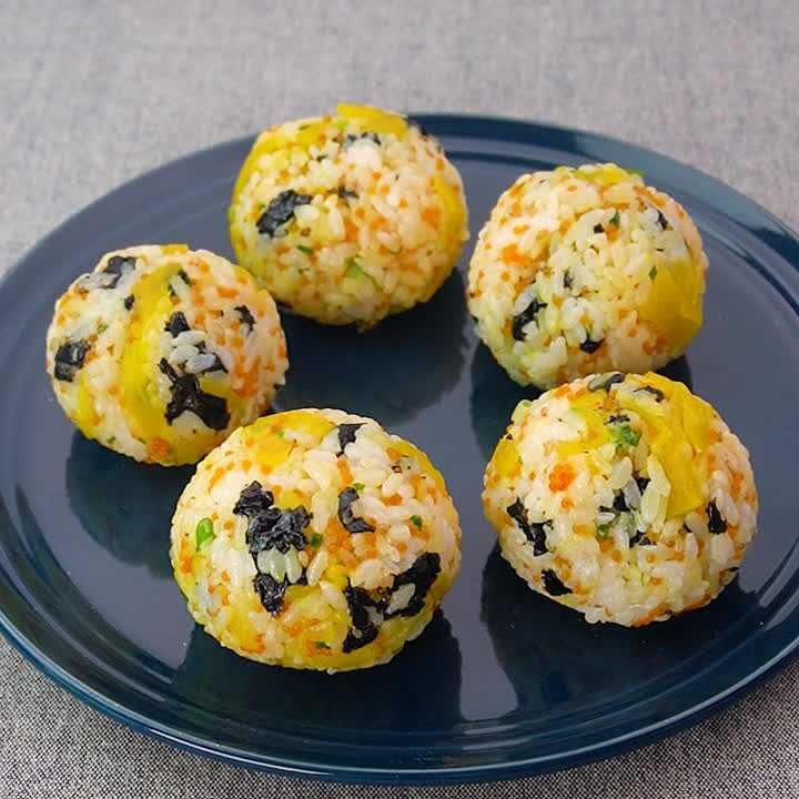 韓国の定番おにぎり『チュモッパ』。, 優しい味でとびっこのプチプチ感が食べててとても癖になる。, 混ぜ合わせるだけで簡単なので,台所も汚れないし手軽で最高。,チュモッパ ,材料2人前 , 白米:250g, ごま油:大さじ1, 韓国海苔:10枚, たくあん:30g,鮭フレーク:20g, とびっこ:30g, マヨネーズ:20g, 万能ネギ:適量,おにぎりチュモッパ韓国料理。