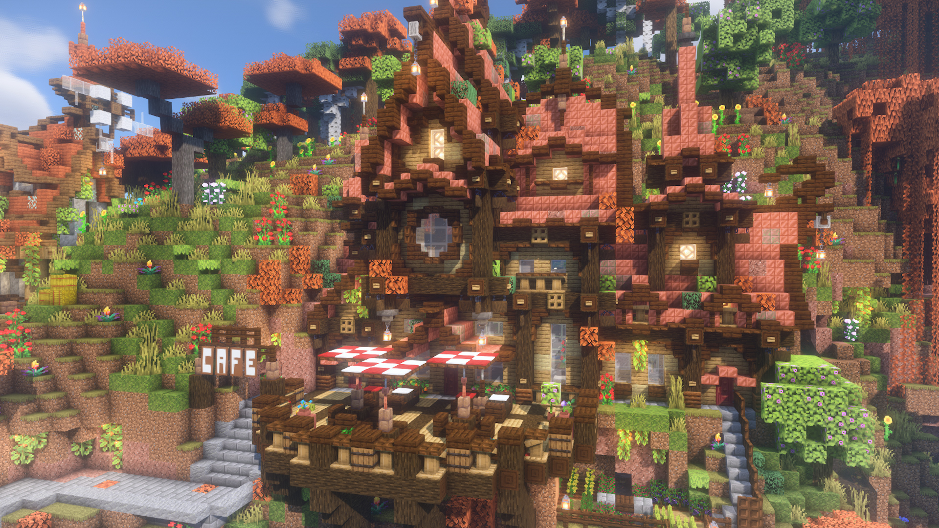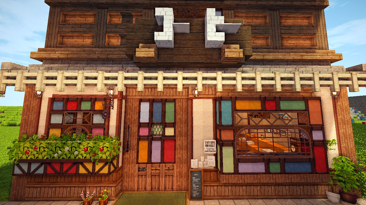 Cafe in colorful town カフェに旗で看板をつけたらそれらしく 店内では店員さんが働いてます Texture: VanillaVersion : JAVA 1.18.1 Shader : BSL v8.1minecraftminecraftbuildsマイクラマインクラフトマイクラ建築minecrafthouseminecraftcity。