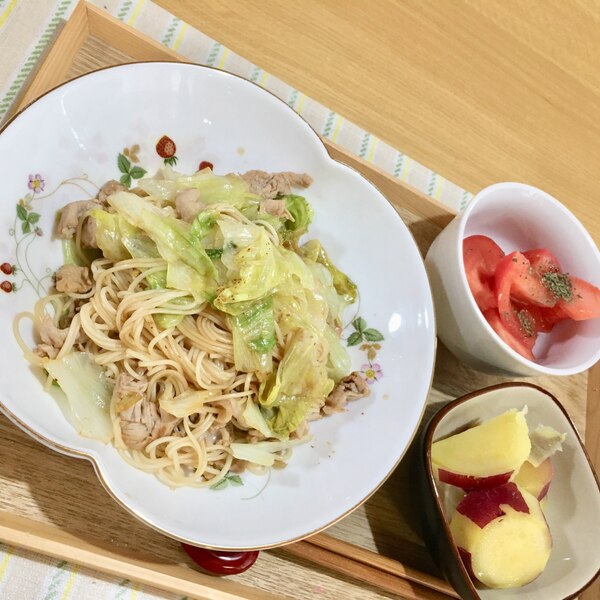 素麺チャンプル定食 さつま芋レモン煮、トマト和え。