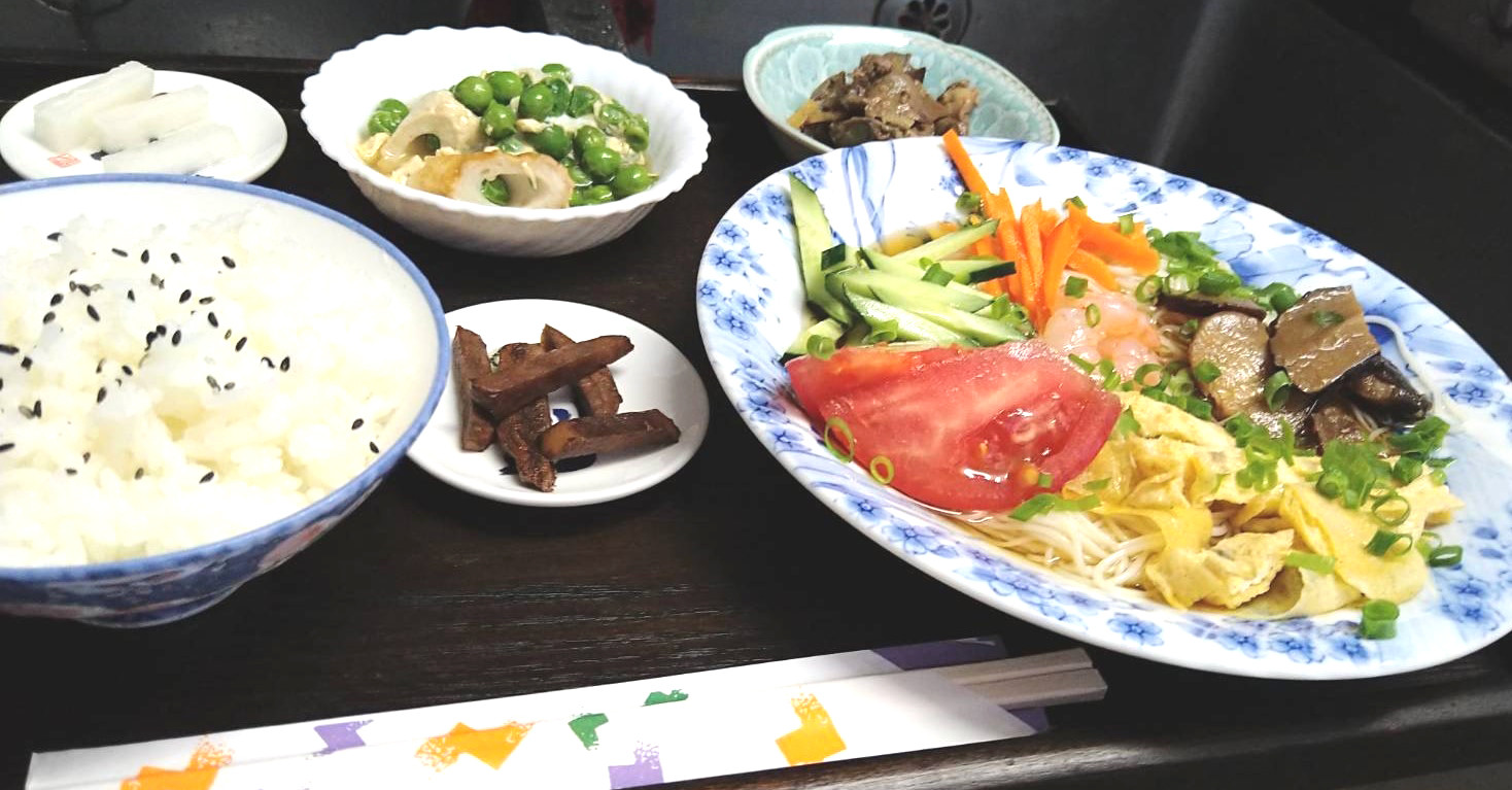 今日の晩御飯はそうめん定食を 作りました😊🍜🥢🥒🥚🧊🌈✨。