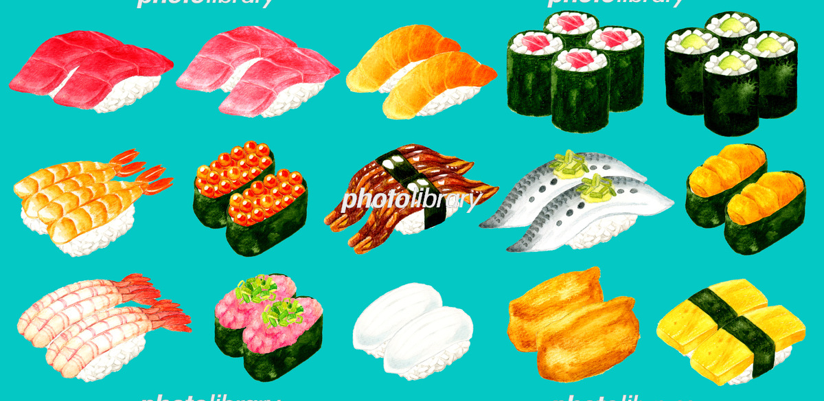 色々な種類のお寿司のセットイラスト 日本料理の手描き水彩イラスト素材集 イラスト素材7030332- フォトライブラリ。