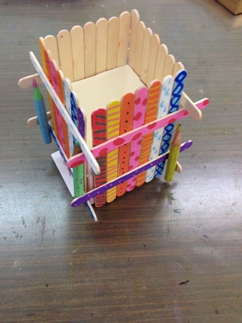 カラフルなハンドメイド 手作りペン立て 雑貨 アイスキャンディー棒でカラフルペン立てC。