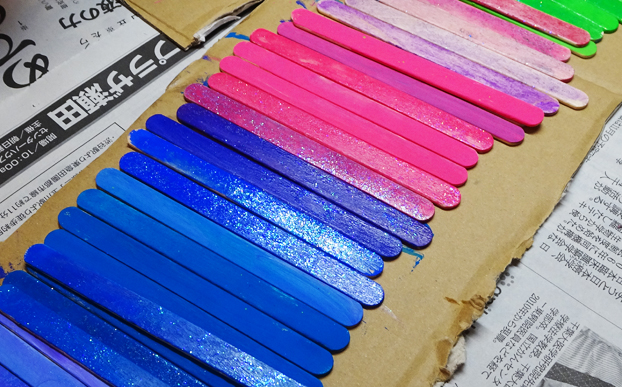 工作 幼児でも簡単!アイスの棒でカラフルなペン立てを作ったよ。お気に入りのラメ入りアクリルガッシュ。Dear Smile。