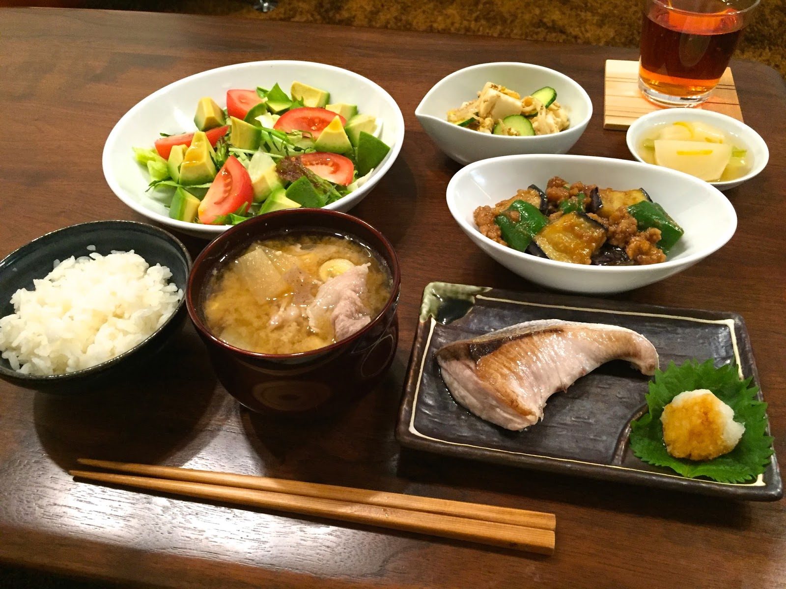 てっちゃんちのおいしい献立: ぶりの塩焼き&なすとピーマンの味噌炒めと一蘭。