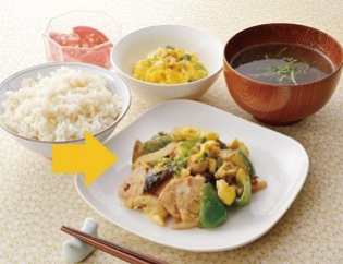「ひき肉とキャベツのにんにくみそ炒め」の献立。