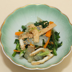 献立みそで簡単!小松菜と厚揚げのにんにく味噌炒め。