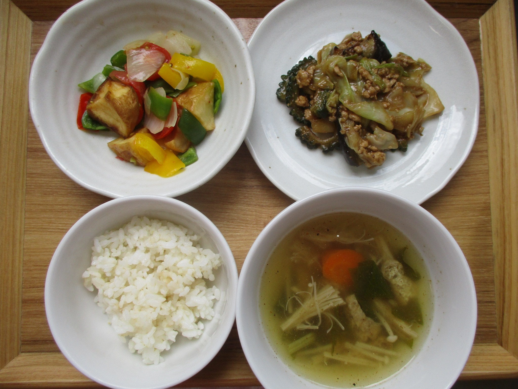 ゴーヤと豚の味噌炒め、トマトとなすのサラダ献立。カリッとした毎日。