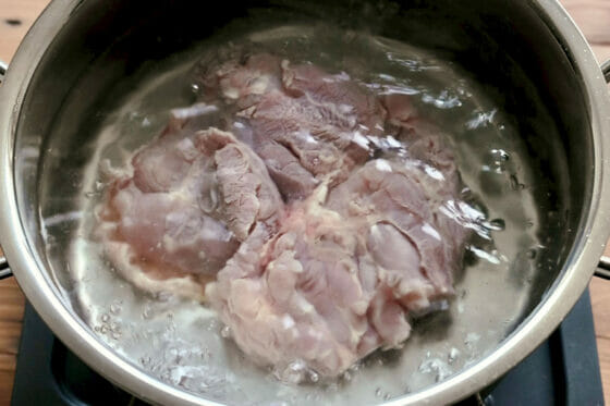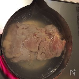 鶏のむね肉を切らずにそのままの形でゆでる方法 食材の下処理手順煮物レシピと調味料の割合。