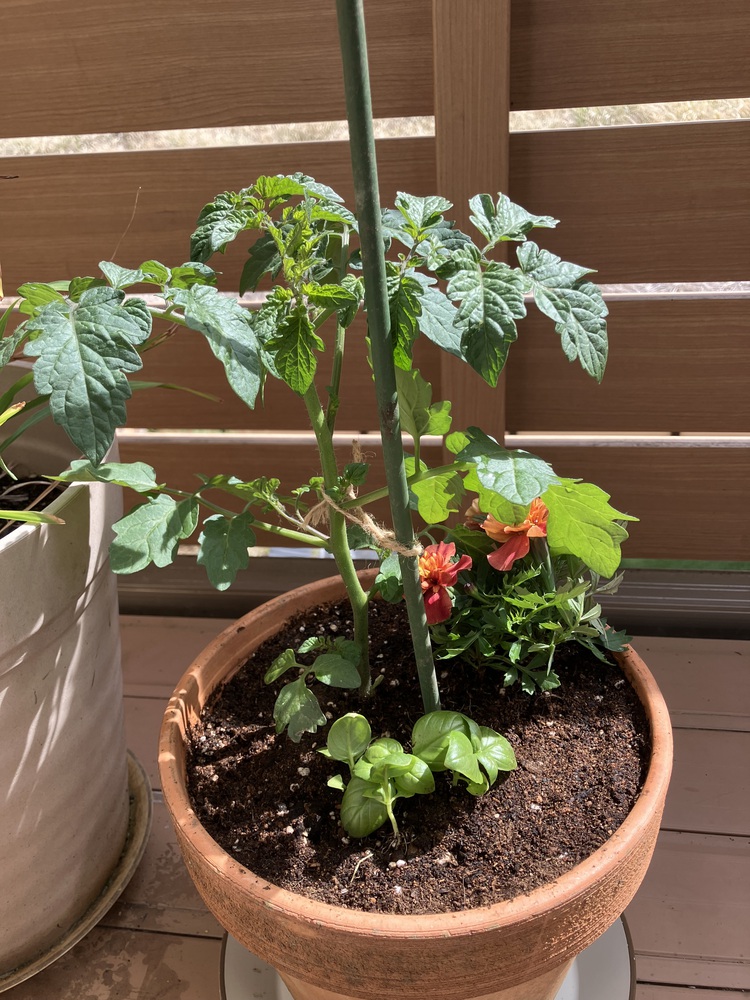 ミニトマトとハーブで作った寄せ植え。 ミニトマトと育てる時に相性が良いと言われる植物コンパニオンプランツ を植えました。バジルは土の中の余分な水分を吸ってくれてトマトをより美味しく実らせてくれると言われています。 マリーゴールドは野菜を育てる時に土の中。