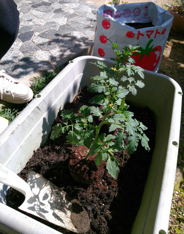 水やりして元気になったこあまちゃんをプランターに植え付けしました。丸い鉢には初めてカゴメさんのトマト の土を使ってみました。他は一般的な野菜用の腐葉土を使用。コンパニオンプランツにマリーゴールド、バジルみんなとカゴメでつくるコミュニティ&KAGOME。