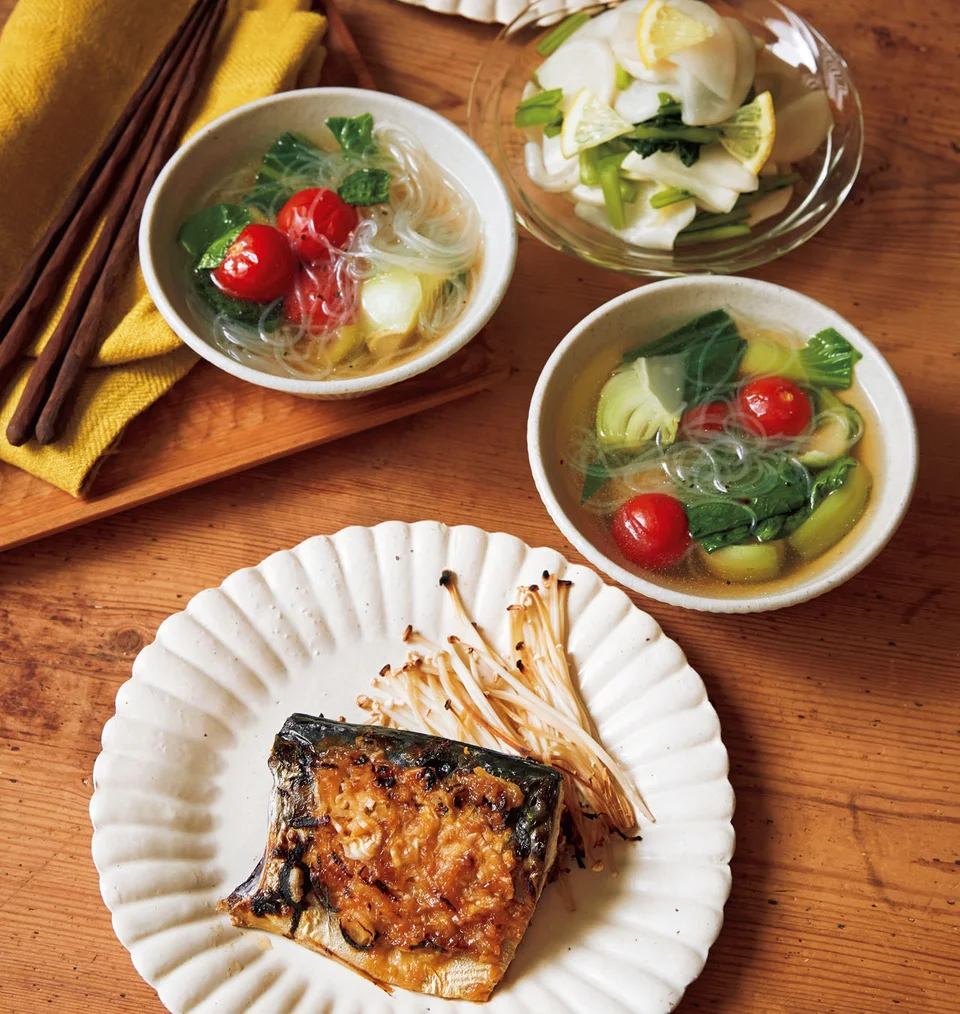 さばのさっぱりみぞれ煮と副菜の献立。