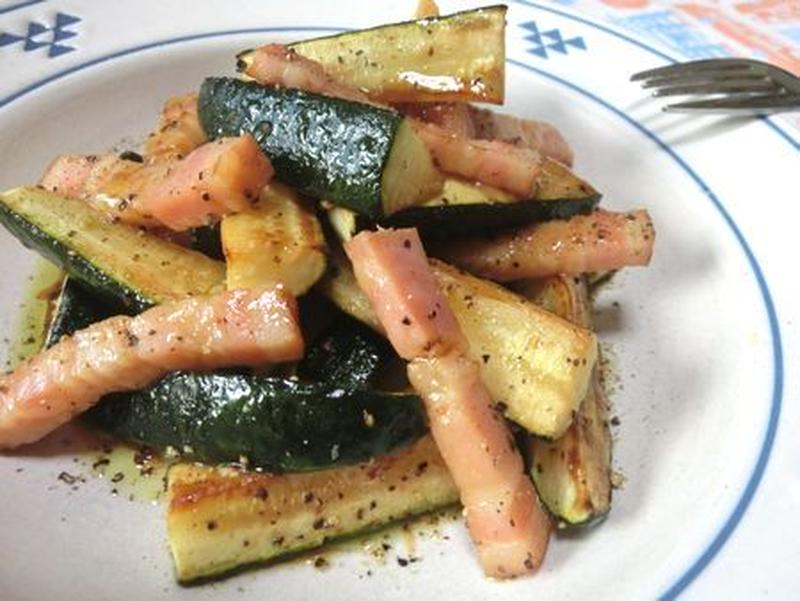 豚バラ肉とズッキーニのポン酢炒め柚子胡椒風味。