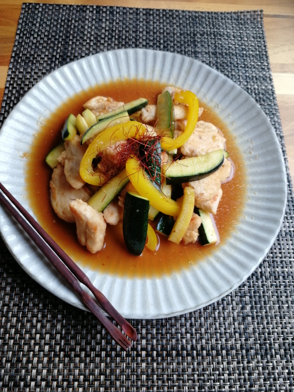 鶏肉とズッキーニの甘酢炒め。