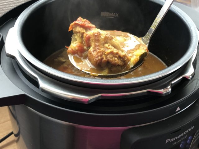 パナソニックの電気圧力鍋SR-MP300レシピ 無水調理バターチキン夏野菜カレーようでん。